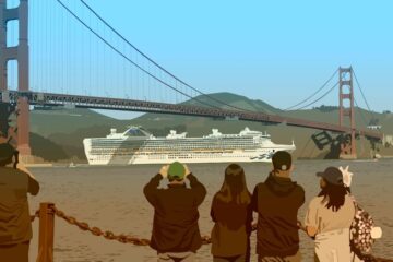 The vessel Grand Princess progress to the port of Oakland and quarantine during the early months of the COVID-19 pandemic is represented in Grand Princess (2024). The drama plays out reframed by Ezawa as a movie playing at Fort Mason FLIX, FMCAC’s pandemic-era pop-up drive in movie theater. In this work, the artist commissions a cover of “I Left My Heart in San Francisco” by the Red Room Orchestra featuring Petra Haden, underscoring this now-historical moment’s many tones of anxiety, grief and dread.