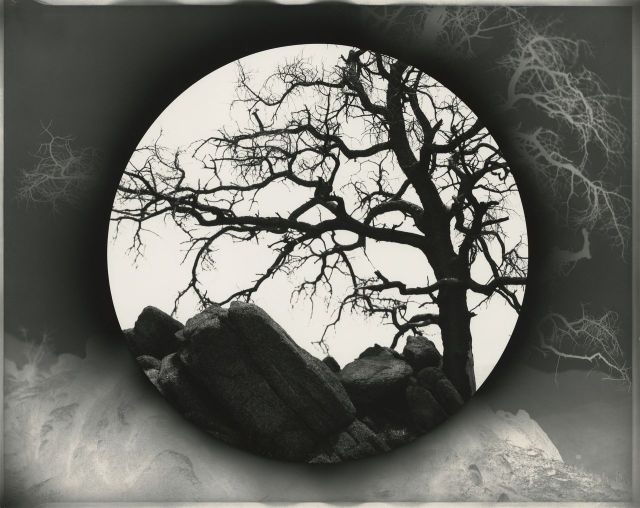 Our photoreceptors turn light into signs via the human eye. Perception can sometimes chain us to the expected, the predictable, and our own set of assumptions about the world. The Inverse series reveals overlapping realities existing simultaneously using solarization techniques. The process of in-camera solarization is achieved through a tonal reversal between negative and positive, caused by overexposure and achieved only through analog means. With his handmade cameras, McCaw utilizes this complex photographic process to compose bifurcated landscapes that disrupt our expectations. In Inverse 117 (Burnt, Anza Borrego), 2025, a bright circle outlines dark, gnarled, leafless tree branches growing out of jagged rocks. Around its perimeter, ghostly branch tendrils float in dark grey. The circle’s shape suggests something planetary, perhaps the sun itself. The circle is also an eye, a peep-hole, and a binocular exposing the night vision of the tree to daylight.